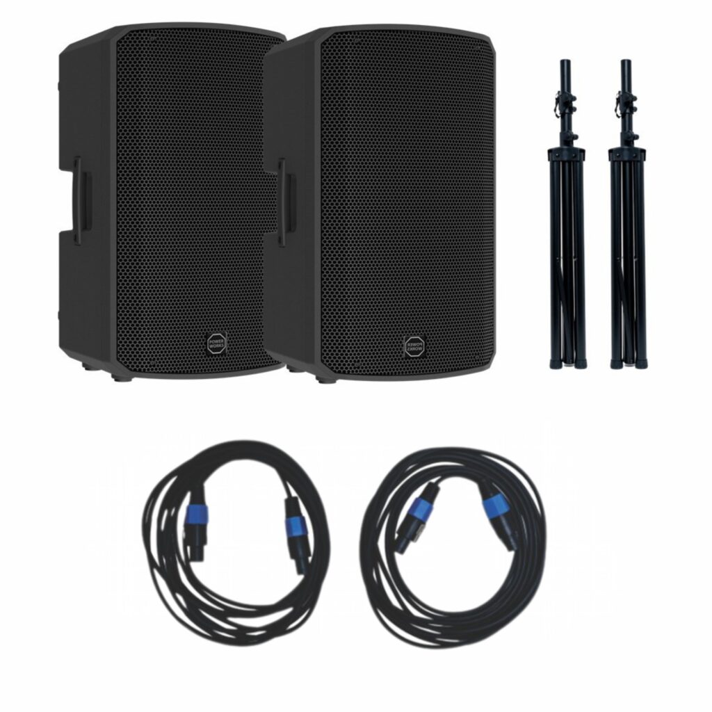 The PowerWorks Party-Pro Duo is a complete sound system featuring one active and one passive 15″ 2-way speaker. It delivers 220W RMS power and a max SPL of 116 dB. With Bluetooth (TWS), multiple input options, onboard EQ, and user-friendly controls, it’s ideal for events and parties. The package includes 2 speaker stands, 1 power cable, and 1 speaker cable.